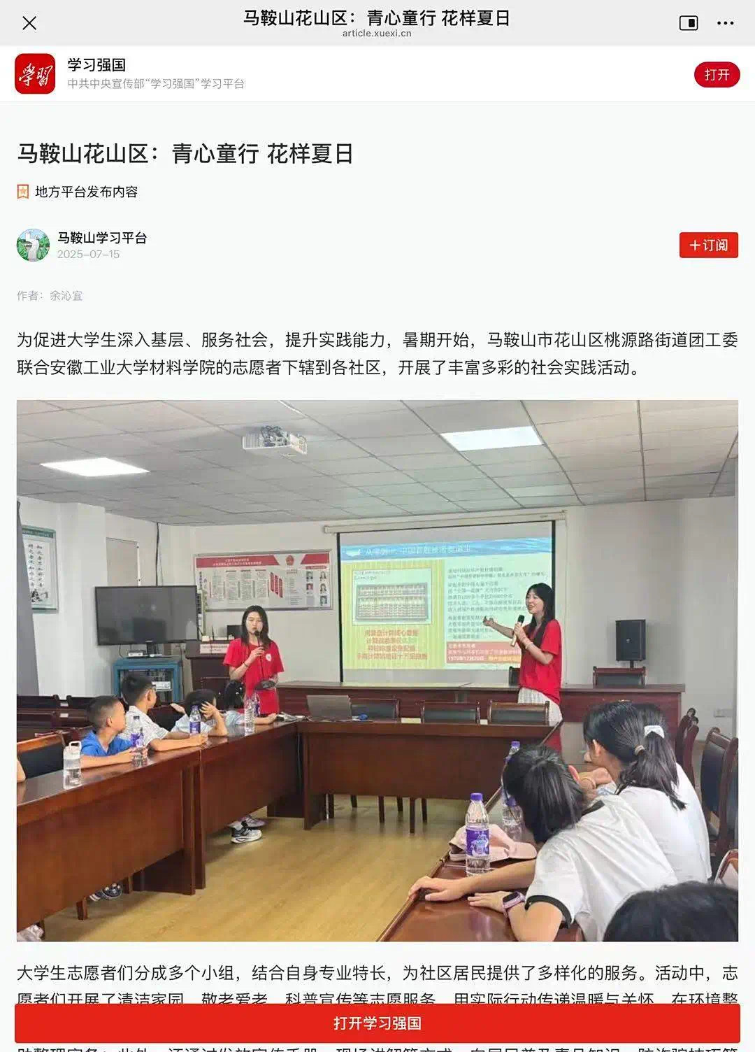 为促进大学生深入基层、服务社会,提升实践能力,暑期开始,马鞍山市花山区桃源路街道团工委联合安徽工业大学材料学院的志愿者下辖到各社区,开展了丰富多彩的社会实践活动。