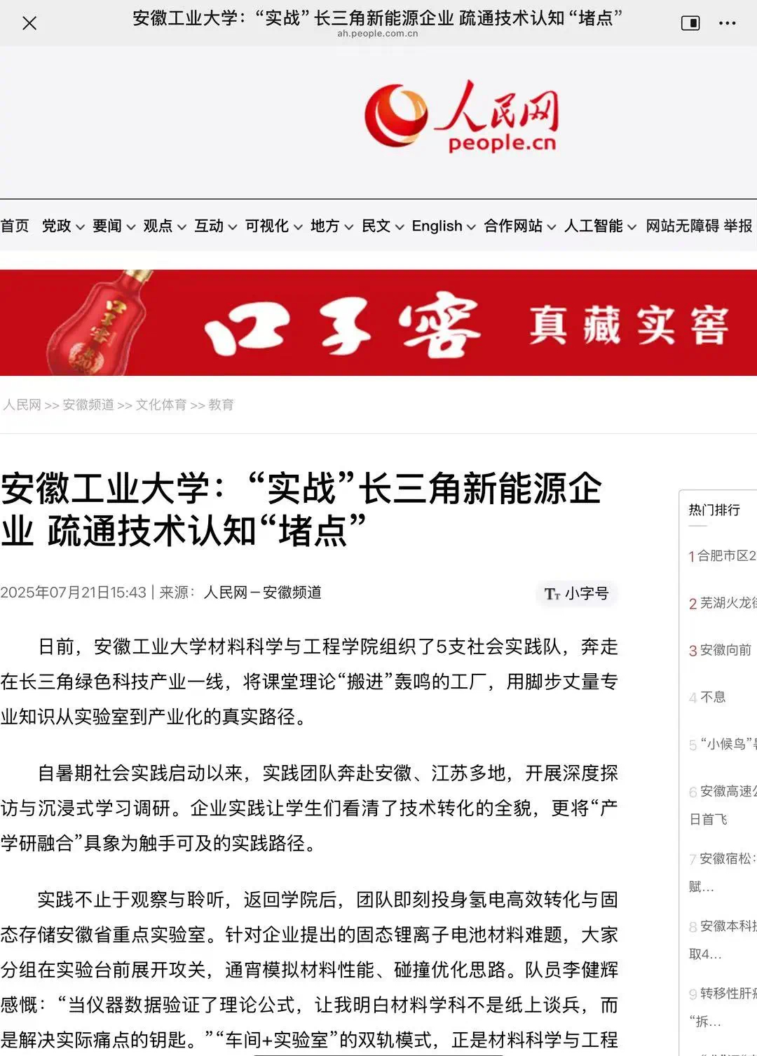日前,安徽工业大学材料科学与工程学院组织了5支社会实践队,奔走在长三角绿色科技产业一线,将课堂理论“搬进”轰鸣的工厂,用脚步丈量专业知识从实验室到产业化的真实路径。