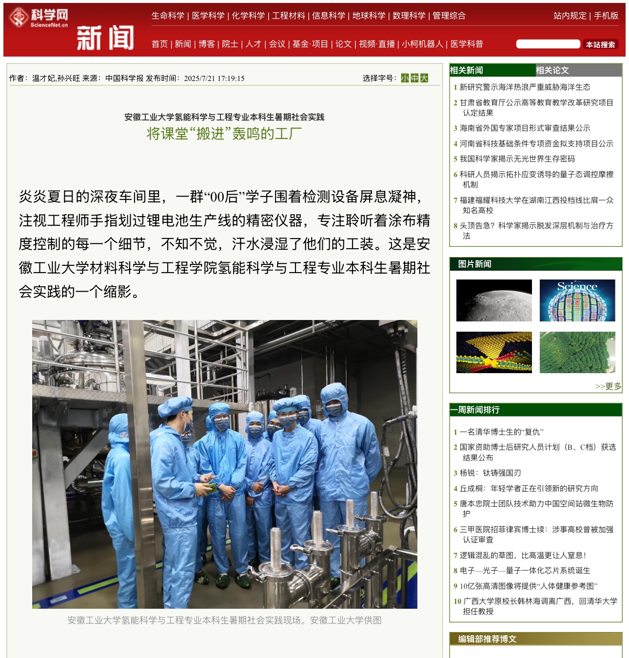 炎炎夏日的深夜车间里,一群“00后”学子围着检测设备屏息凝神,注视工程师手指划过锂电池生产线的精密仪器,专注聆听着涂布精度控制的每一个细节,不知不觉,汗水浸湿了他们的工装。这是安徽工业大学材料科学与工程学院氢能科学与工程专业本科生暑期社会实践的一个缩影。今年七月,该学院组织了5支社会实践队,奔走在长三角绿色科技产业一线,将课堂理论“搬进”轰鸣的工厂,用脚步丈量专业知识从实验室到产业化的真实路径。