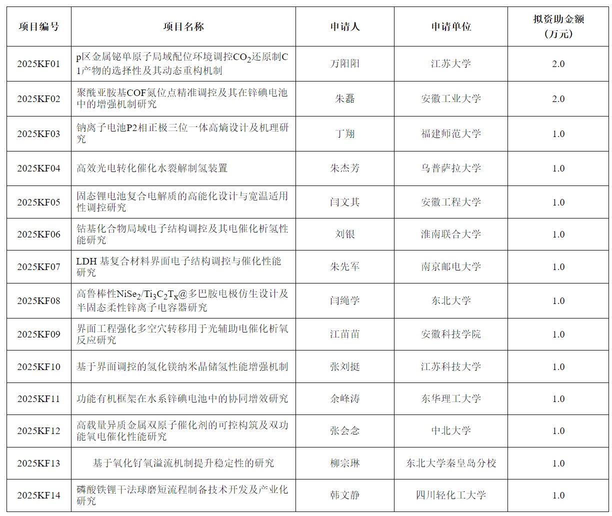 根据《氢电高效转化与固态存储安徽省重点实验室开放基金管理办法》(2025修订)的规定,实验室于2025年11月12日在官方网站发布了《氢电高效转化与固态存储安徽省重点实验室2025年度开放基金申请指南》,并接收项目申请。经专家评审,拟立项并资助14个项目(按姓氏笔画排序)。现公示如下: