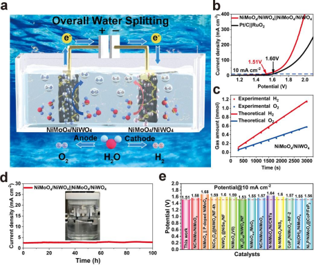 研究团队采用简单的一步水热法,在泡沫镍基底上构筑了具有杨梅状形貌的NiMoO4/NiWO4异质结构催化剂,在碱性电解液中表现出卓越的双功能催化活性和稳定性。异质界面的形成可调控材料的电子结构,促进电荷转移,从而显著增强催化活性。在1 M KOH溶液中,该催化剂在HER反应中仅需17 mV过电位即可达到10 mA cm−2电流密度,优于商用Pt/C催化剂 (33 mV);在OER反应中于10 mA cm−2下的过电位为240 mV,优于RuO2 (294 mV)。此外,基于该催化剂组装的整体水分解系统仅需1.51 V电压即可达到10 mA cm−2电流密度,并具有超过100小时的持续运行稳定性。密度泛函理论 (DFT) 计算表明,NiMoO4/NiWO4异质结构在费米能级附近具有更高的电子态密度,优化了H原子在Ni活性位点上的吸附/脱附能,使ΔGH*值接近于零 (–0.026 eV)。