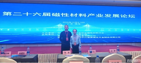 2025年12月3-5日,安徽工业大学材料科学与工程学院“磁电功能材料”团队负责人夏爱林教授与侯龙博士参加了由中国电子材料行业协会磁性材料分会、工信部磁性材料及器件专业情报网等联合主办的第26届磁性材料产业发展论坛,并就团队在M型锶铁氧体等方面的研究进展作了邀请报告。本次会议旨在探讨中国磁性材料行业现状、动态与当前形势,帮助中国磁性行业相关企业预判中国磁性材料产业技术与市场发展趋势,全面推动中国磁性材料产业高质量创新发展。本次参会人数近300人,为同领域内规模最大的磁性材料应用研讨会之一。