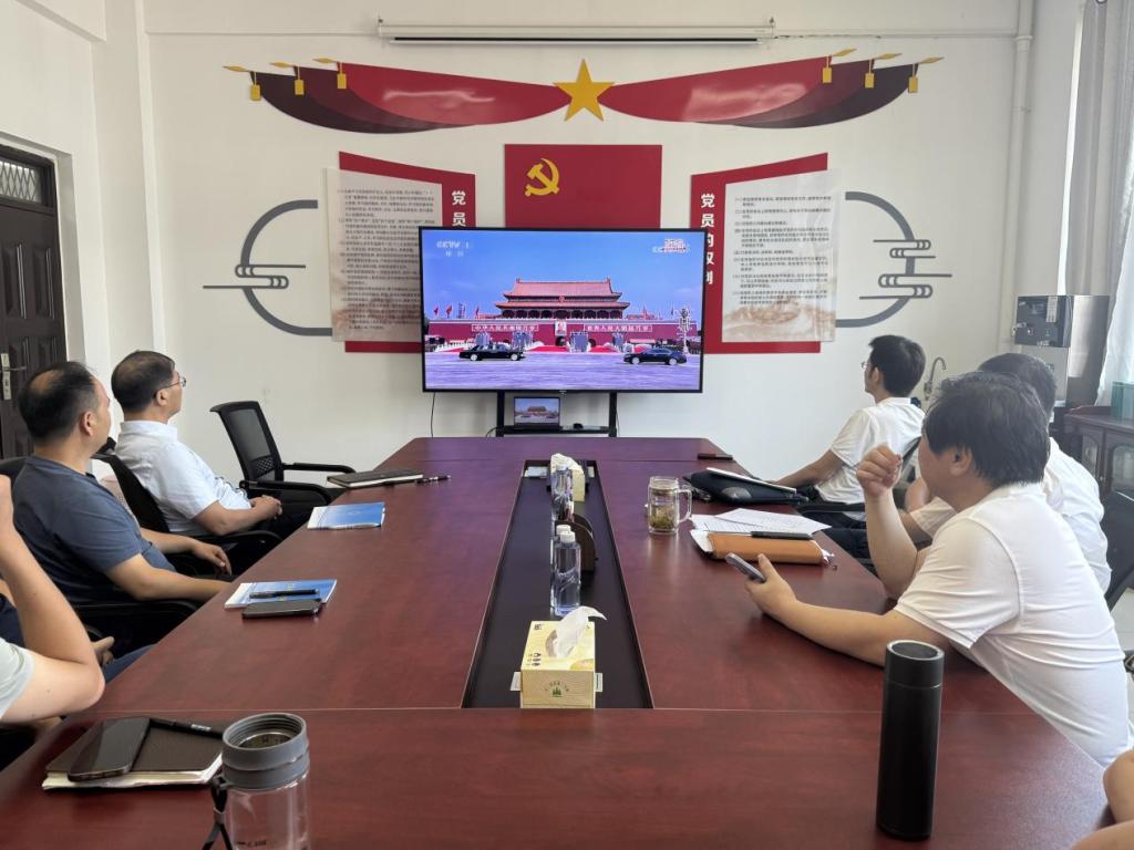 随着阅兵仪式正式启动,大家目光聚焦屏幕,认真观看每一个环节——从空中护旗梯队护卫旗帜、悬挂标语展现大国气象,到徒步方队中抗战老部队传承红色基因、新力量彰显强军风貌;从战旗方队承载先烈功勋、续写精神荣光,到装备方队与空中梯队亮出“国之重器”、展现现代化国防实力,再到联合军乐团奏响抗战经典曲目、唤醒历史记忆,每一个震撼人心的画面都让在场人员深受触动。观看过程中,大家始终保持专注,不时为阅兵仪式的恢弘气势、人民军队的威武英姿鼓掌致敬。随后与会人员围绕此次纪念活动进行了交流发言。